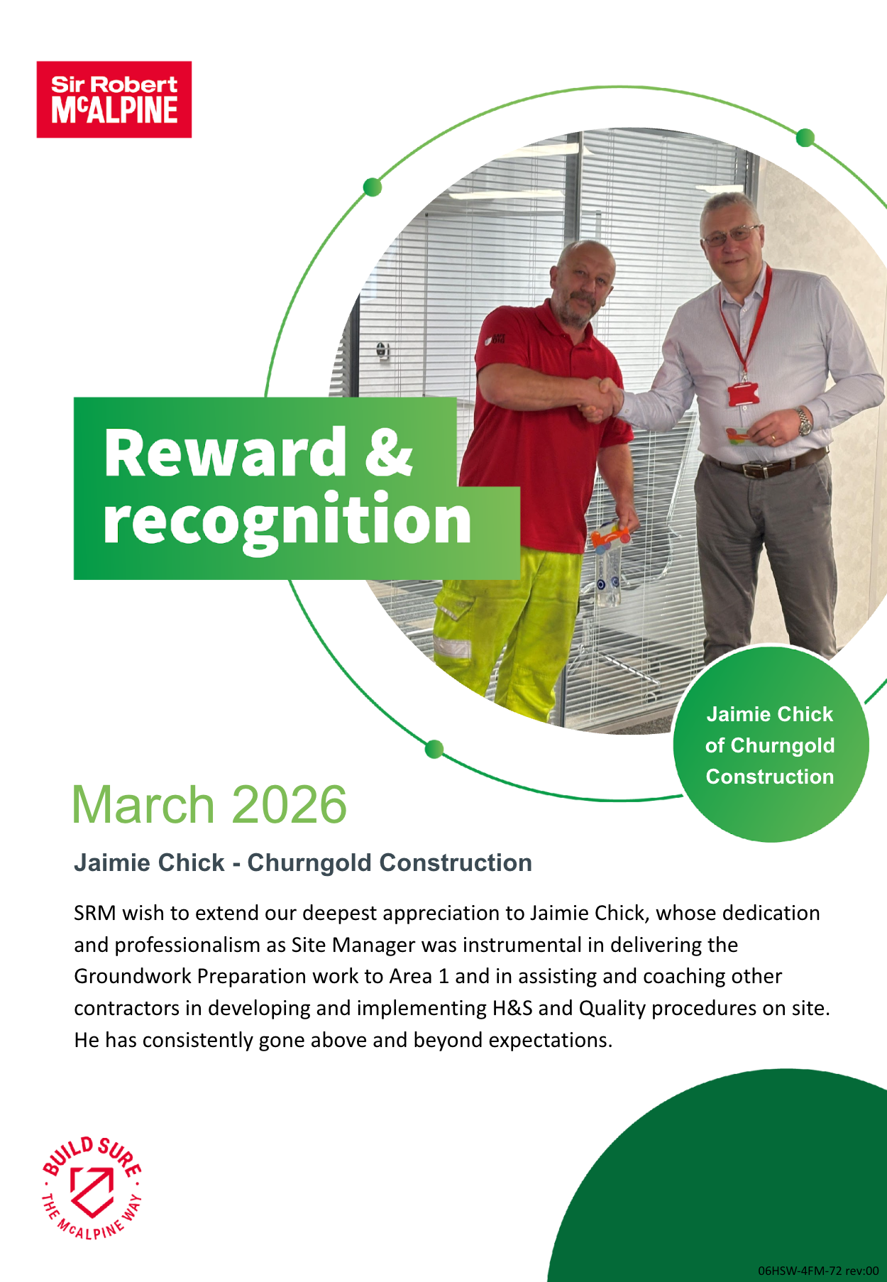 Congratulations to Jamie Chick, who’s dedication and professionalism have been rewarded by Sir Robert McAlpine. Churngold have matched the voucher award.